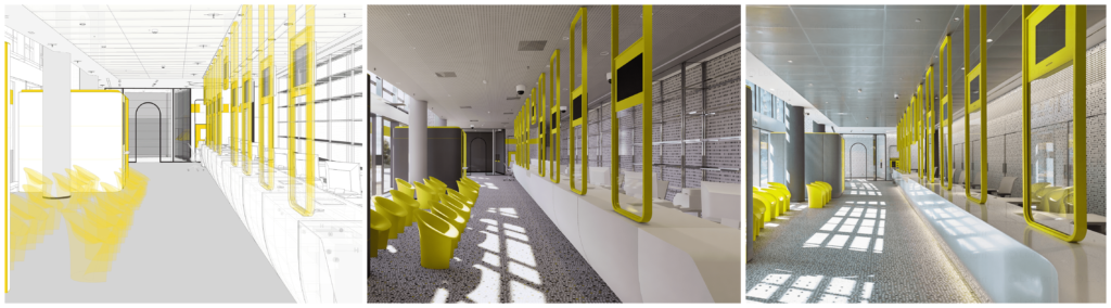 In alto il progetto dell’ufficio delle poste nel palazzo della regione a Milano. Da sinistra verso destra: il modello Revit di lavoro, il modello Revit renderizzato in realtime tramite enscape e infine una foto del progetto realizzato.