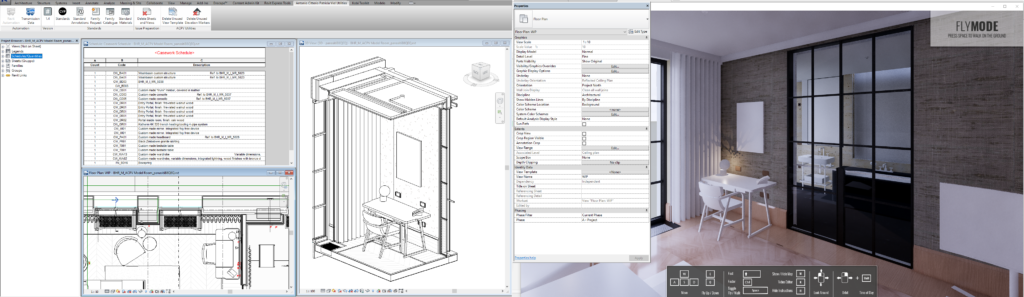 Per sfruttare al massimo le potenzialità dei programmi la progettazione in Revit viene affiancata all’uso di renderizzatori in real time, che a differenza dei render statici (prodotti “finiti” rivolti al cliente per comunicare un concetto) sono uno strumento per il progettista che può non solo osservare lo spazio da tutte le angolazione ma anche eseguire alcune analisi qualitative relative all’illuminazione degli ambienti ed sperimentare in tempo reale e molto efficientemente le diverse opzioni del progetto.