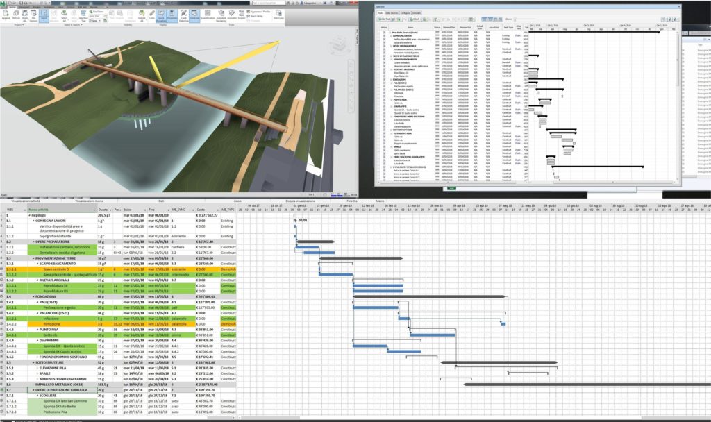 Tutti gli elementi sono stati “catalogati” secondo una medesima struttura, che costituisce i documenti contabili, i capitolati speciali di appalto e la pianificazione dei lavori. Quest’ultima, realizzata in Project, era collegata al modello BIM in Navisworks creando sia la simulazione 4D delle fasi di costruzioni, sia la pianificazione 5D con i costi derivanti nell’arco di tempo.