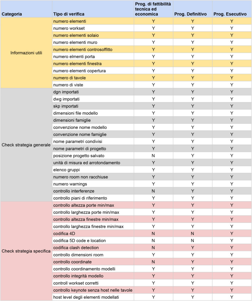 • Check della strategia in riferimento ad informazioni per uno specifico progetto – monitoraggio delle problematiche specifiche relative agli obiettivi del processo BIM (es. codifica 4D, codifica 5D, codifica Clash Detection, coordinate dei modelli ed eventuali Parametri realizzati ad hoc per il progetto).